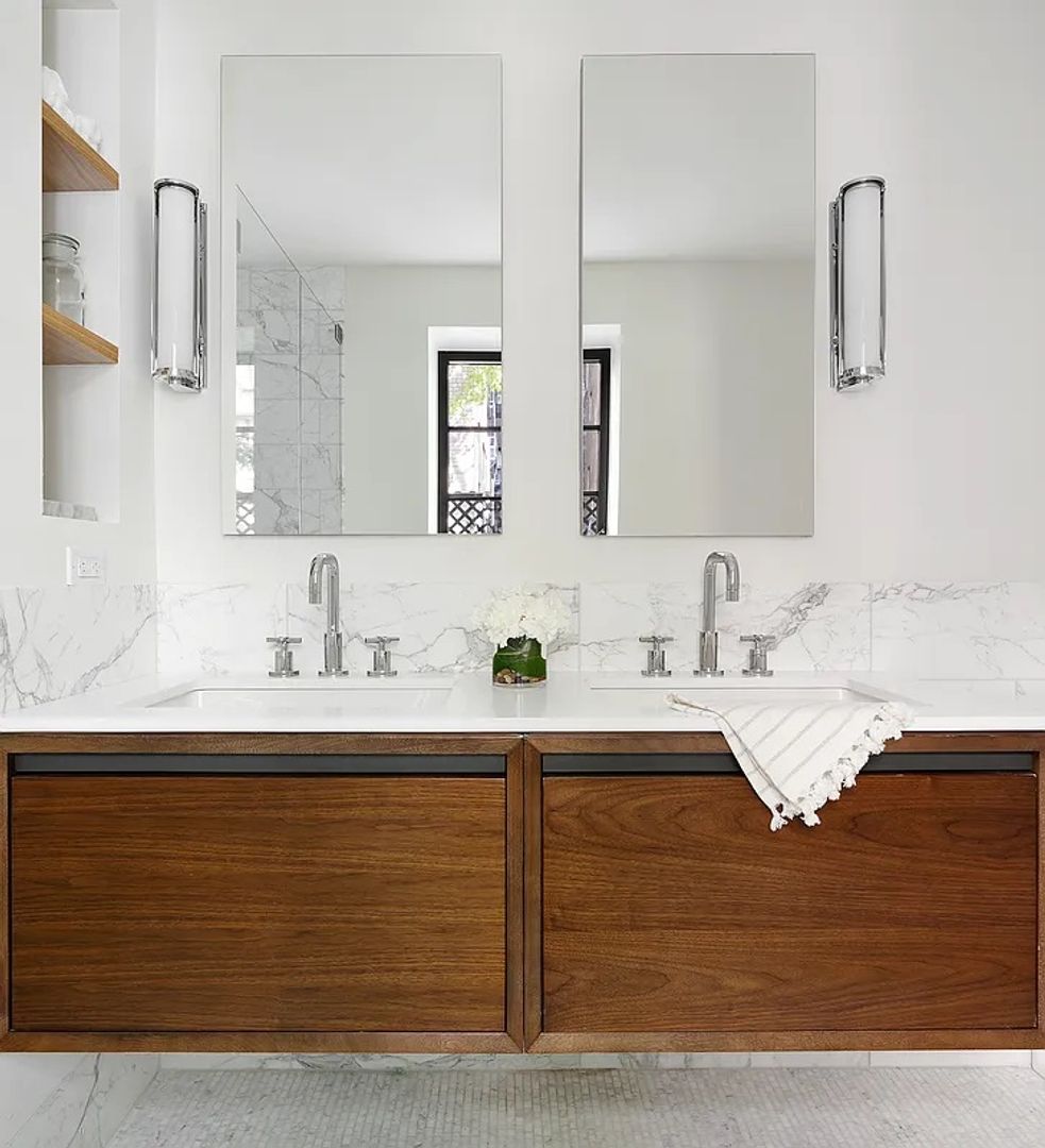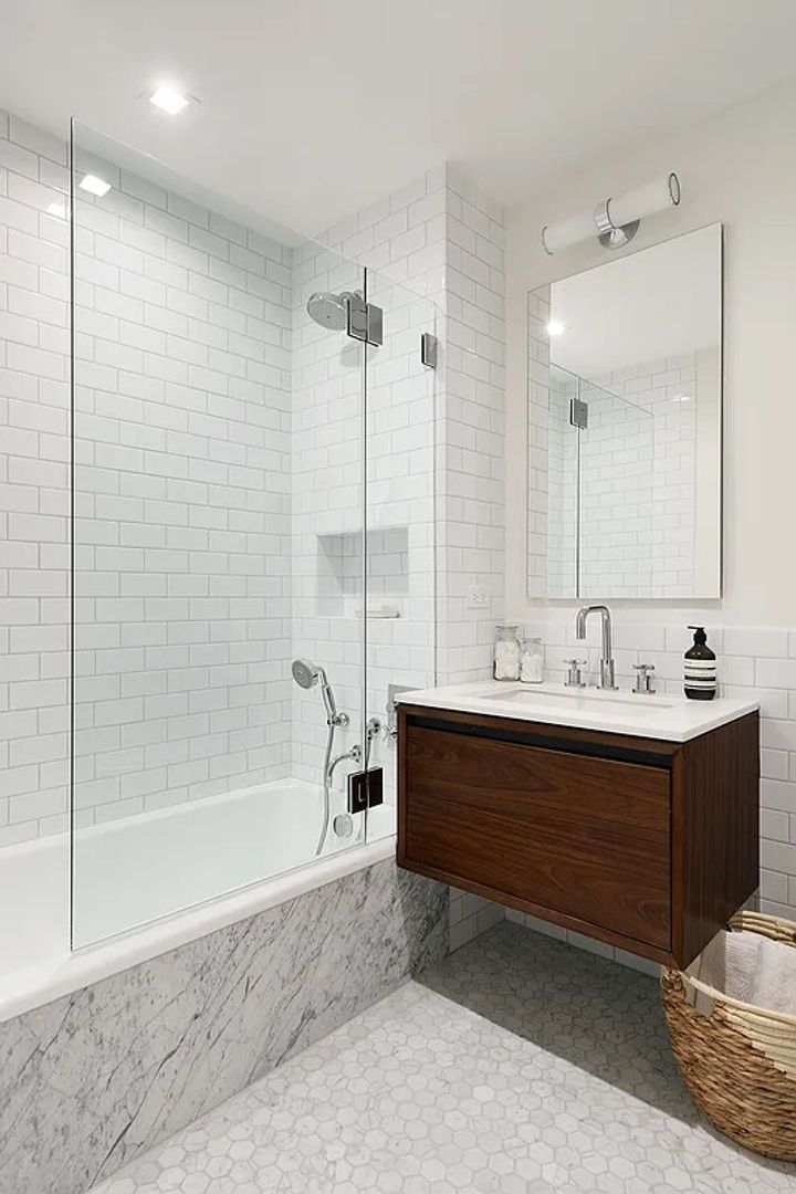 The generous entry foyer opens to a 25-foot living/dining room. The separate galley PoggenPohl kitchen includes Caesarstone countertops, Liebherr and Bosch appliances, and a vented range hood. The tranquil, corner primary bedroom has three large windows, easily fits a king-size bed, and includes a spacious walk-in closet. The en-suite windowed bath features a custom marble mosaic floor, glass-enclosed shower, a double walnut vanity, mirrored medicine cabinets and built-in storage. The two secondary bedrooms are generously sized, share a full bath with marble floors and a Waterworks cast iron tub, and can be closed off from the main living space via solid wood pocket doors for privacy.